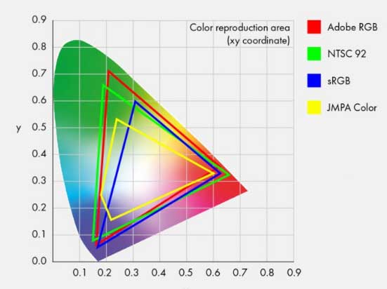 色域(Color Gamut),就是指某顯示設備所能表達的顏色數量所構成的范圍區域。為了能夠直觀地表示色域這一概念,國際照明委員會(CIE)制定了一個用于描述色域的方法:CIE-xy色度圖。 在這個坐標系中,各種顯示設備能表現的色域范圍用RGB三點連線組成的三角形區域來表示。 在此區域內,設備顯示區域的三角形的面積越大,就表示該設備的色域范圍越大。