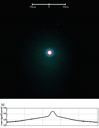 在實驗中,我們應用iXon Ultra 897 EMCCD(Andor的DU897U-CS0-BV)相機,非常成功的拍攝了腔體發光的空間分布影像。圖2給出了高度布居的基態光子(N0/N>60%)的圖像,周圍被更高能量光子所形成的熱云包圍。借助于iXon相機的單光子靈敏度和高動態范圍,我們通過單次實驗獲得了雙模光子空間分布的全部信息。