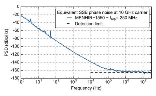 Menhir Photonics 具備極低位相噪聲和極高可靠度。圖1展示了250MHz重復(fù)頻率的MenHIR-1550 自由運(yùn)轉(zhuǎn)時(shí)的典型位相噪聲。相位噪聲在10GHz載波(40階諧波)上測(cè)量。噪聲本底給出的累積時(shí)間抖動(dòng)上限越為500as(阿秒)。