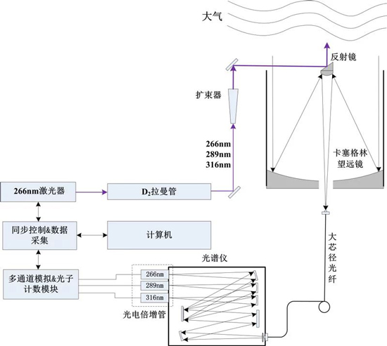 臭氧雷達(dá)系應(yīng)用差分吸收原理,通過高能Nd:YAG激光器發(fā)射266nm的紫外脈沖激光,其中一束位于臭氧氣體的吸收線上,另一束位于吸收線之外,組成一對探測波長。266nm激光通過拉曼管后產(chǎn)生289nm、299nm和316nm三個波長激光,266nm和289nm、289nm和299nm、299nm和316nm一共組成3個波長對,分別對應(yīng)不同的探測高度和探測時間(白天或夜晚)。每一個波長對的其中一個波長位于臭氧吸收較強(qiáng)的位置,而另一個波長位于臭氧吸收很弱或物吸收的位置,利用臭氧對這兩個激光波長的吸收差別(兩種波長光信號的消光比),確定兩個脈沖激光共同路徑上臭氧的濃度,從而實(shí)現(xiàn)對臭氧時空分布的探測。