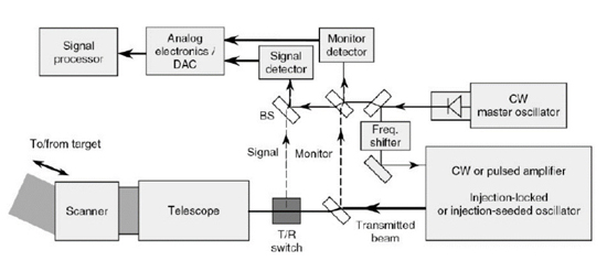 測風(fēng)激光雷達(dá),按照工作體制分類,可以分為相干探測和直接探測兩種方式。伴隨光纖激光器的出現(xiàn),市場現(xiàn)在主要偏向基于1550nm人眼安全激光相干探測原理進(jìn)行測風(fēng)激光的研究。相干探測是通過對回波信號的多普勒頻移進(jìn)行測量得到風(fēng)速的變化,與直接測量不同的是,相干探測是將信號光與本振光進(jìn)行相干混頻,混頻的信號光進(jìn)行到探測器,通過探測器中的中頻濾波得到移頻信號,從而得到風(fēng)速的變化信息。
