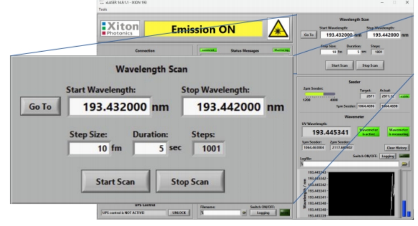 我們把Xiton公司的xLASER激光控制軟件右上部分放大給您看,這個角落就是WL-Scan波長掃描參數控制欄,您可以設置波長調諧的起始和終了位置,波長掃描步長(最小10fm)和間隔時間。
