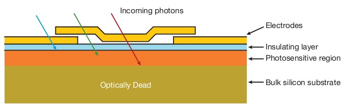 量子效率主要由芯片的光敏硅層吸收光電子的能力所決定,而這層光敏層,亦稱擴散區。僅在該區域中,光子轉化成電子-空穴對,并由電場禁錮在像素中,然后電荷再依序被讀出。