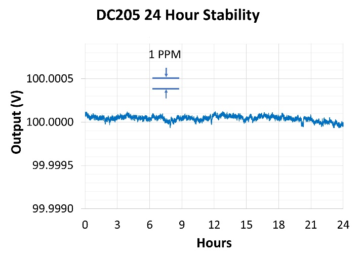 DC205 具有出色的噪聲特性——在 1 V 范圍內(nèi),rms 噪聲小于 1 µV(0.1 Hz 至 10 Hz)。它在一年內(nèi)的精度也達(dá)到 0.0025 %,并且具有出色的溫度穩(wěn)定性,規(guī)格小于 1 ppm/°C。