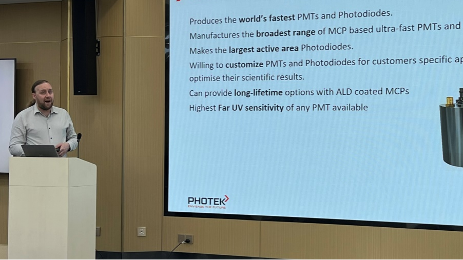 Photek公司銷售經理Fenton Mann以及技術專家Thomas為大家介紹Photek真空離子探測器及弱光成像類產品。Fenton主要介紹了超快光電倍增管和高分辨率光子計數成像系統等超快弱光探測產品,此外還介紹了真空粒子探測器在高能光子成像、場離子顯微鏡化學反應動力學、同步輻射及低溫物理領域的應用,同時該產品作為粒子速度影像系統的核心探測器件目前已經在國內的中國科學技術大學、復旦大學上海交通大學、中國科學院物理研究所和上海科技大學等高校科研院所的原子分子物理實驗室里面廣泛使用。