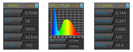 基本模式中,可以得到測量光源后的相關色溫(CCT)、顯色指數(CRI)、照度(LUX)、峰值波長P、曝光時間(I-Time)。