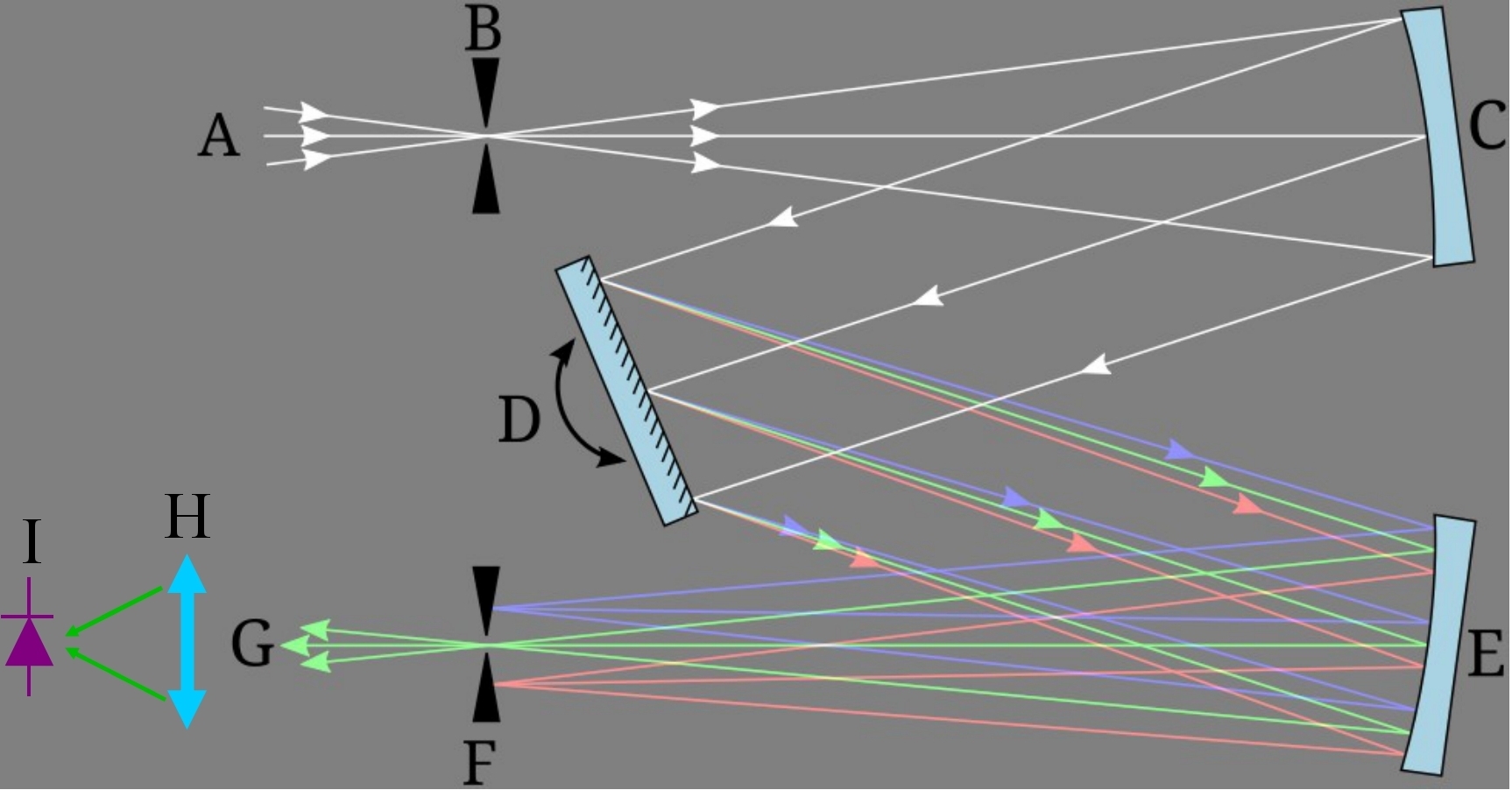 E為匯聚鏡,F(xiàn)為出射光學(xué)狹縫,G為出射光,H為匯聚鏡,I為探測器。
