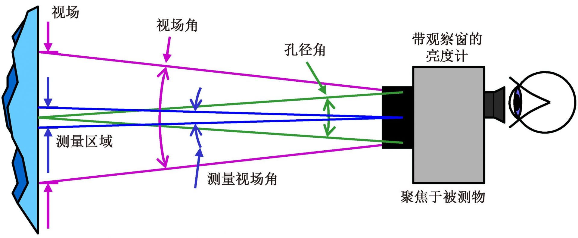 亮度色度計(jì)是用于測量光源發(fā)射出的380~780nm的能量。因?yàn)閮x器是瞄準(zhǔn)光源測量亮度,所以必須要明確測量視場角和孔徑角。
