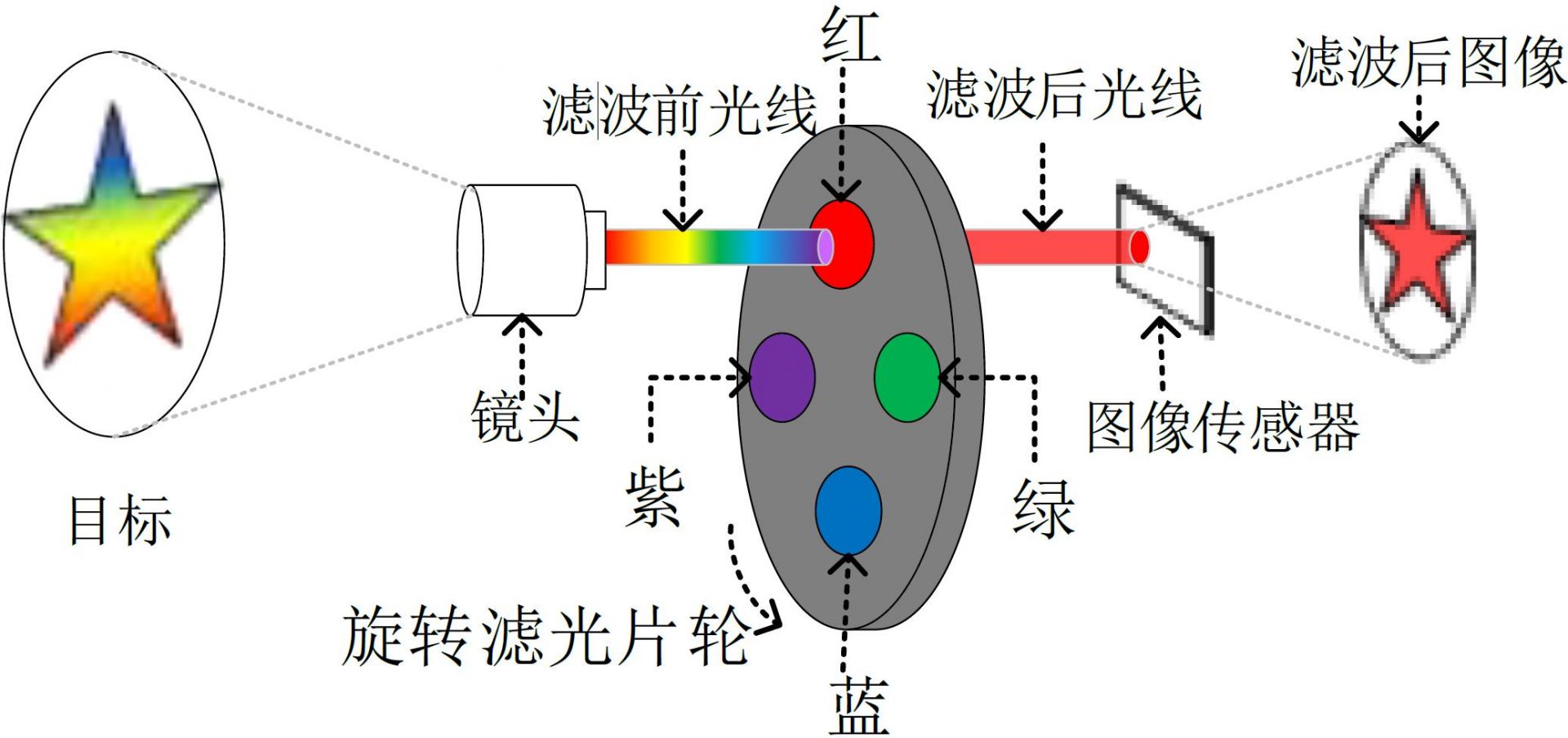 濾光片式彩色亮度計(jì)的色度測量功能的實(shí)現(xiàn),是通過用合適的濾光片模擬人眼對光的響應(yīng),從而使加濾光片以后的圖像傳感器的相對光譜響應(yīng)度與CIE 1931標(biāo)準(zhǔn)色度觀察者色匹配函數(shù)相接近。其測色原理如下:
