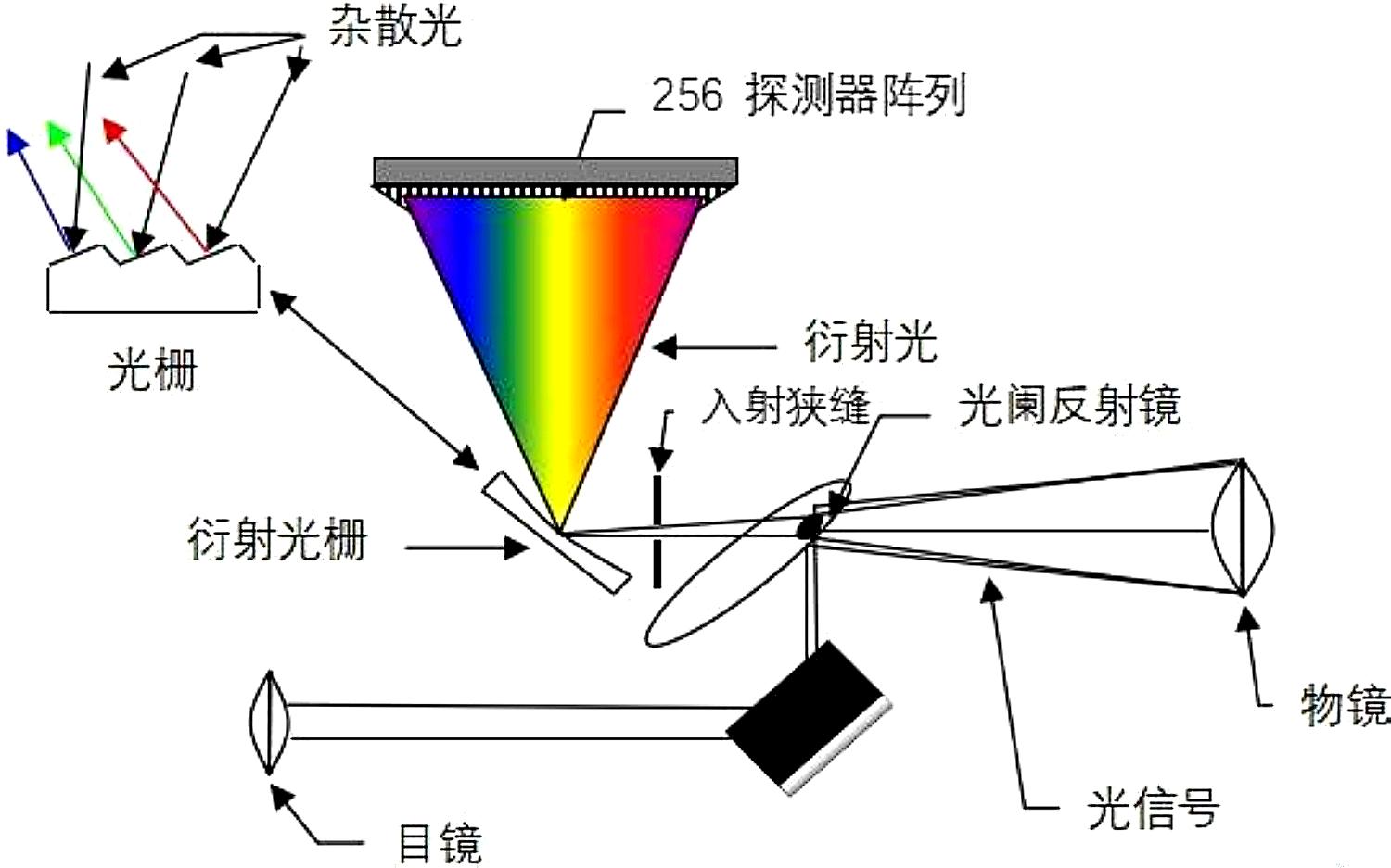 入射狹縫決定了進(jìn)入單色器的光的多少。狹縫越小,分辨率越高,但整體靈敏度越低。衍射級次過濾器用于減少光柵衍射的高級衍射光。準(zhǔn)直器將光線準(zhǔn)直到光柵或棱鏡。無論是使用光柵分光,還是用棱鏡分光,儀器測得的光源數(shù)據(jù)都是一致的。光柵或棱鏡用于入射光的色散。匯聚光學(xué)元件將光線匯聚到探測器(光電倍增管、CMOS傳感器或CCD陣列)上。控制和日志系統(tǒng)用于定義和存儲(chǔ)數(shù)據(jù)。