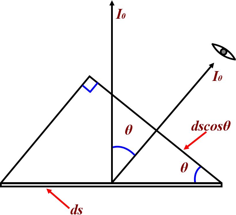 式中,Lθ為θ方向上測量的亮度值,單位cd/m2。可見,任意方向的Lθ=I0/ds為一定值,故人眼在任意方向觀看朗伯光源時(shí),所感知的亮度是相同的,即所謂朗伯光源是各向同性光源。