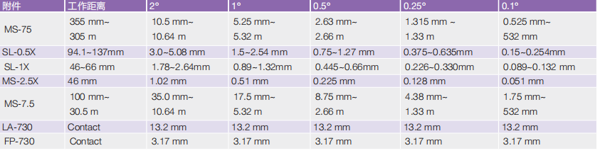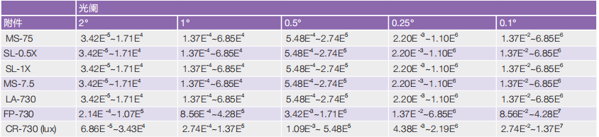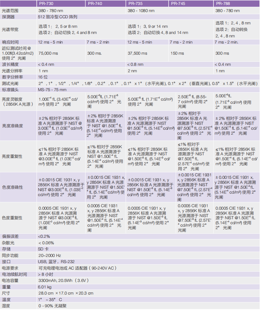 備注:亮度值均是在 2°光闌,PR-730/740:8nm 光譜寬度 , PR-735/745: 14nm 光譜寬度條件下計(jì)算得出。