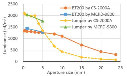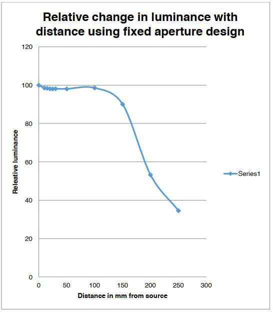 Photo Research的固定孔徑附件在測量設備的較大運動范圍內可以變化很小。 當被測光源不再充滿透鏡的入射光瞳時,測得亮度會快速變化。但經過校準在2-6mm的孔徑之間,亮度幾乎沒有變化。