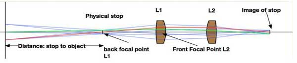 參考上圖,位于L1后焦點的遠心光圈定義了圖像尺寸隨對象位置的變化。 第二個鏡頭將光圈聚焦到固定點。 L1位于L2的前焦點,因此使L1的出瞳變為遠心。 L1和L2的位置之間的關系提供了高度的瞳孔混合。 通過在L1的前表面放置一個物理擋塊,可以調整該系統的視場。 通過將MS-75鏡頭用作光學系統中的L2,可以將該設計體現為PRISM-75鏡頭的附件。