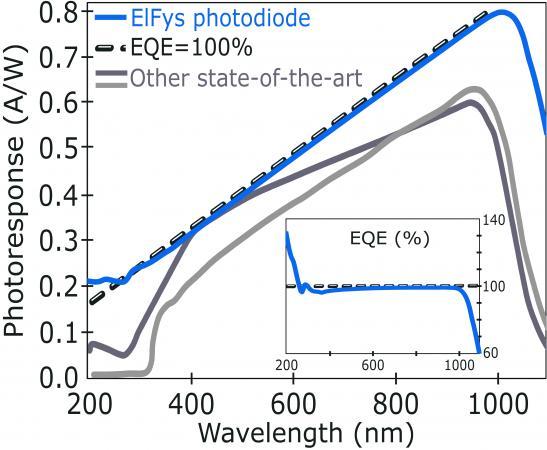先鋒科技可提供高性能的黑硅探測器,該光電探測器通過采用表面納米結(jié)構(gòu)技術(shù)與原子層沉積涂層技術(shù),大大提高了探測器的光收集效率。在 200 nm 至 950 nm 范圍內(nèi)具有近乎完美的光響應(yīng),外量子效率≥ 96%(通過德國國家計量研究院 PTB 認證)。此光電探測器在紫外波段也同樣具有極高的量子效率,比普通的硅光電二極管高出兩倍以上。