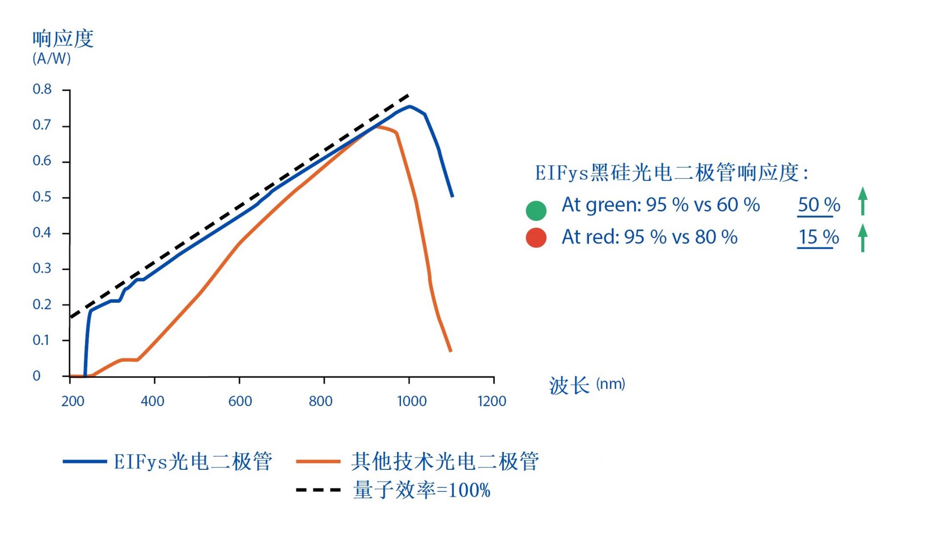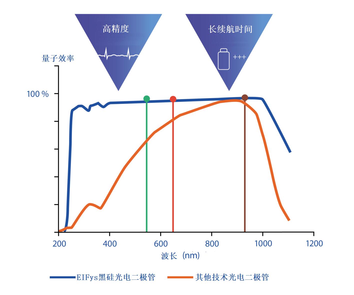 在智能手表等可穿戴設(shè)備中,需要高精度測量和滿足長續(xù)航時(shí)間才能滿足用戶的需求,在所有其他組件中,光電二極管是捕捉從皮膚反射的光信號的關(guān)鍵傳感器,因此,無論之后使用何種軟件AI算法,光電二極管的性能決定了原始數(shù)據(jù)的質(zhì)量,光電二極管重要的參數(shù)之一是靈敏度,給定噪聲的條件下,更高的靈敏度意味著更高的SNR(信噪比),從而可以得到更準(zhǔn)確的測量能力,可以檢測以前不可見的更小信號,與其他光電二極管技術(shù)相比,EIFys提供的高靈敏度光電二極管,采用黑硅技術(shù),如下圖所示,綠光的響應(yīng)度提高了50%左右,紅光的響應(yīng)度提高了15%左右,光電二極管高靈敏度的另外一個好處是它可以用更少的光來達(dá)到同等的精度,這意味著更少的功耗,可提高穿戴設(shè)備的續(xù)航時(shí)間。