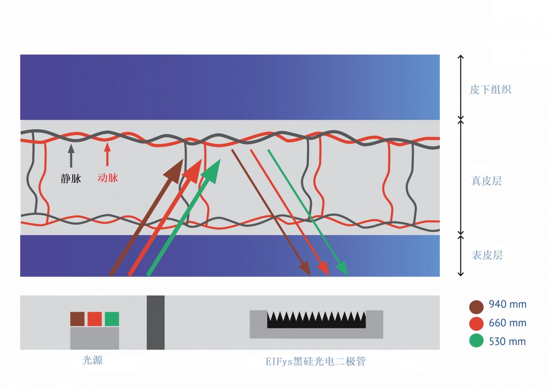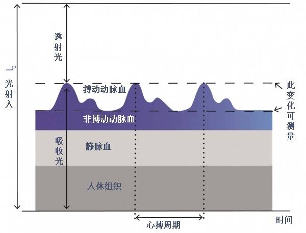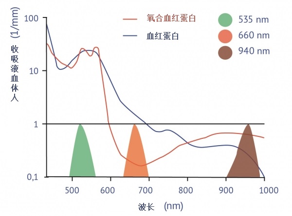 利用光電容積描記(PPG)是使用光電傳感器測量心率和血氧含量水平的基本方法,535nm綠光用于測量心率,皮膚中的血液量隨著心臟跳動周期而變化,因此綠光的吸收和皮膚對綠光的反射也會隨著周期變化,綠光的光信號變化頻率就是心率。同樣的,光的吸收也會根據(jù)血液中與血紅蛋白結(jié)合的氧氣水平而變化,由于660nm紅光和940nm紅外光對氧含量更敏感,因此660nm紅光和940nm紅外光的反射信號主要用來計(jì)算氧含量。