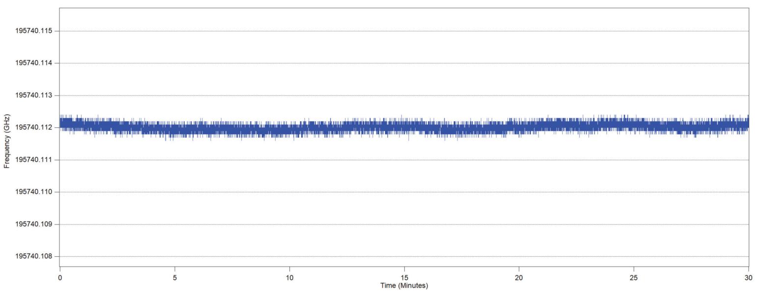 下圖是872A-NIR監測1532nm乙炔鎖頻激光器在30分鐘內的中心波長漂移測量結果。
