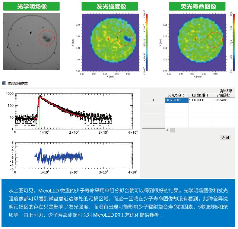 MicroLED 顯示技術是指以自發光的微米量級的LED 為發光像素單元,將其組裝到驅動面板上形成高密度LED 陣列的顯示技術, 在發光亮度、分辨率、對比度、穩定性、能量損耗等方面有很大優勢,可以應用在AR/VR,可穿戴光電器件,柔性顯示屏等領域。由于MicroLED 的尺寸在微米級別,因此需要在顯微鏡下進行檢測。下圖為使用少子壽命成像系統對直徑為80 微米的MicroLED 微盤進行測試。