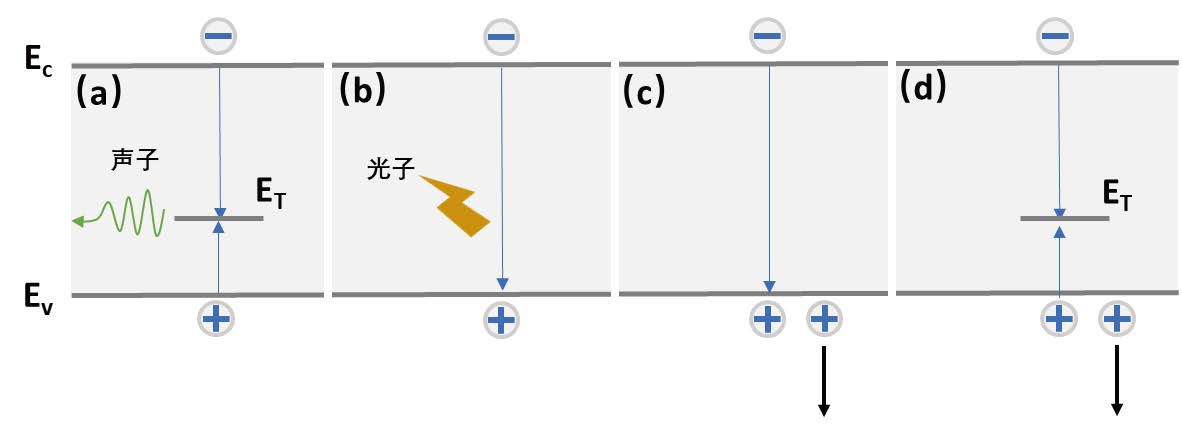 (a) SRH 復合; (b) 輻射復合; (c) 直接俄歇復合;(d)間接俄歇復合