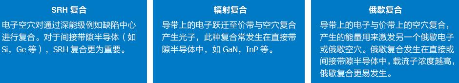 當外界作用撤掉后,處于非平衡態的載流子會通過復合而產生衰減,直到載流子濃度恢復到之前的熱平衡狀態。載流子的復合方式可以分為三類:SRH 復合、輻射復合及俄歇復合(直接和間接)。