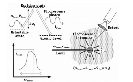 圖1[1]為LIF的基本原理圖,在一個三能級系統中:離子處于亞穩態時,當照射激光能量等于躍遷激發的能量,離子被泵浦到激發態。由于激發態不穩定,離子又會迅速退激到基態并輻射出熒光。在激發態上停留時間很短暫(一般只有幾納秒寬度)。由于離子不是靜止的,根據多普勒效應可知,在激光傳輸方向上存在一個速度選擇,只有在激光傳輸方向上滿足一定速度的離子才能被特定頻率的激光誘導激發:窄帶激光束(ωlaser,κlaser)入射,在入射方向上,只有離子速度  和激光頻率滿足關系式 時,才能通過相應的激光激發被泵浦到激發態。對入射激光頻率進行掃描變換,測量相應的熒光光強變化,就能得到亞穩態離子速度分布函數在入射激光方向上的投影。如果假定亞穩態離子溫度和主體基態離子溫度一致,離子速度分布函數等動力學參數即可獲得。