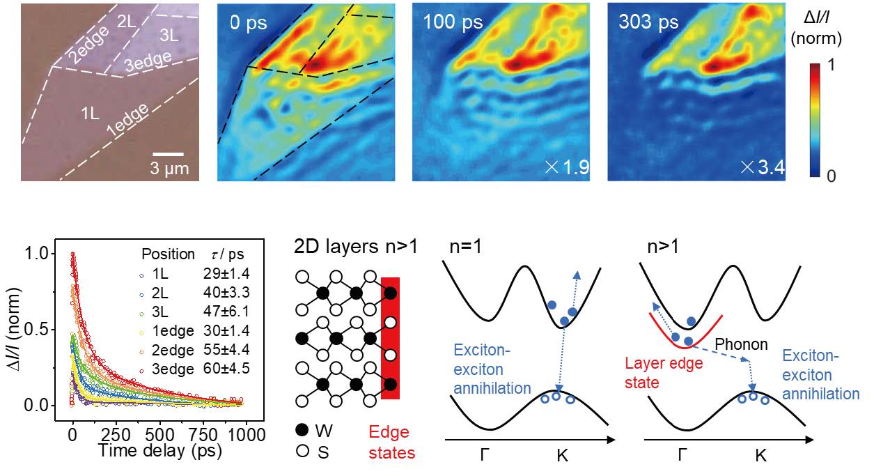二維WS2中激子分布情況,激子壽命研究??梢钥吹剑鄬拥倪吘壘哂懈呒ぷ用芏群透L激子壽命