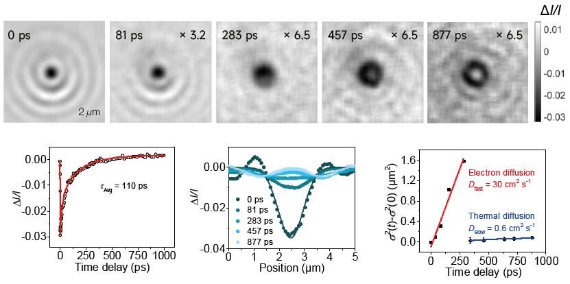 10 nm厚金屬薄膜上的超快熱載流子和熱擴散,采用儀器的點激發,寬場探測模式。