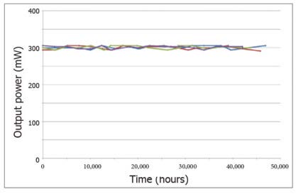 4 款不同的Gem 系列激光器在長時間工作后的功率輸出變化圖