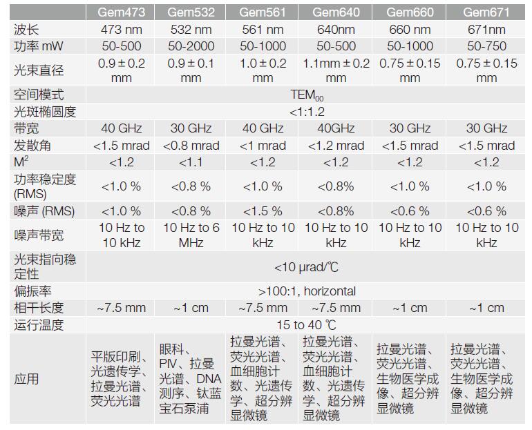| gem532 | LaserQuantum公司明星產(chǎn)品,高品質(zhì)單橫模衍射極限傳輸連續(xù)綠光激光器,高穩(wěn)定輸出功率達(dá)2W。 | 眼科、PIV、拉曼光譜、DNA測序、鈦寶石/鈦燃料激光器泵浦、熒光成像、生物醫(yī)學(xué)成像、光刻、激光多普勒測速儀、光遺傳學(xué) |