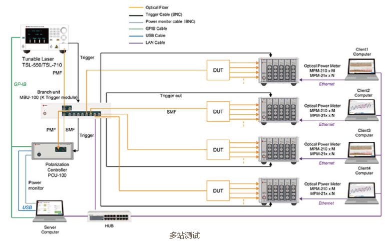 多站測試中,TSL、PCU與MCU 構成一個服務中心,分發觸發信號及光束到不同的測試站。每個測試站包括功率計和客戶端PC。在運行過程中,TS持續的掃頻,使得每個測試站可以獨立而并行地工作。多站測試架構極大提升了高精度測量與分析的效率。