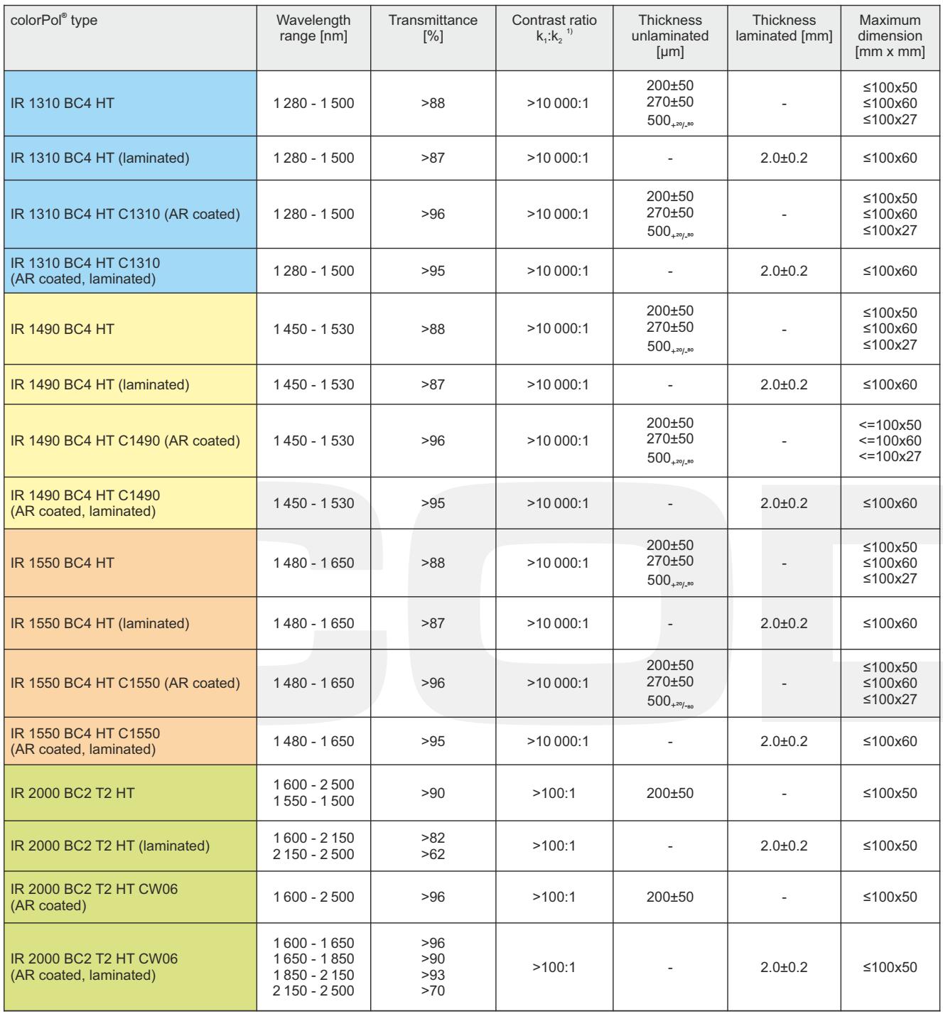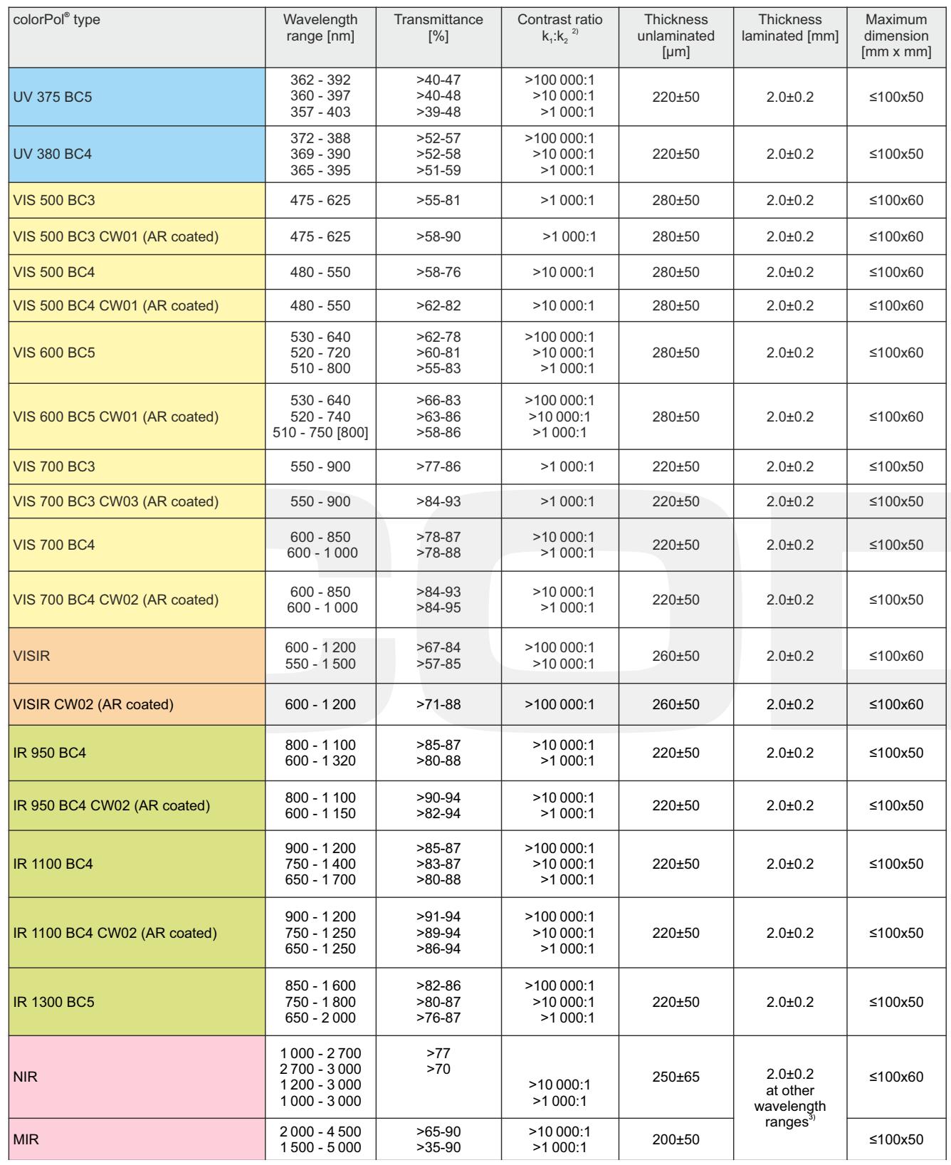 colorPol® 偏振片是由帶有銀納米顆粒的高強(qiáng)度鈣鈉玻璃制成的二向色玻璃偏振片,偏振片可用于紫外波長范圍(340 nm - 420 nm)和VIS、NIR、MIR波長范圍(440 nm - 5.0 μm),大入射角±20°,偏振軸精度高,透過率*高可以達(dá)到96%,消光比*高可以達(dá)到100000:1