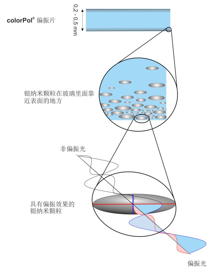 通過CODIXX的特殊制造技術(shù),可以精準(zhǔn)確定銀納米顆粒的大小、密度和方向。橢圓形的幾何形狀產(chǎn)生偏振特性所需的一個長軸和一個短軸。它們根據(jù)波長吸收光的所有橫波,僅允許沿對稱軸方向的光波通過。所有納米顆粒的分布必須絕對平行,以產(chǎn)生完美的線偏振光。