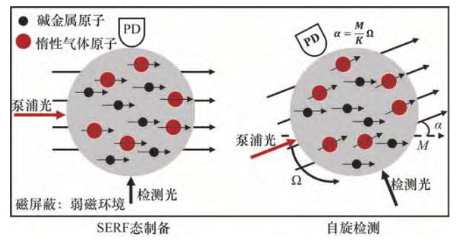 SERF原子自旋陀螺儀利用電子自旋敏感物體轉(zhuǎn)動,具有精度高、體積小的特點。其主要工作過程為原子SERF態(tài)制備以及原子自旋進動檢測。其工作原理如圖 6所示,磁屏蔽裝置使原子處于近零磁場環(huán)境中,此時堿金屬原子的拉莫爾進動頻率大幅降低,同時由于高密度高壓環(huán)境使自旋交換率極大提升,從而充分抑制原子的自旋交換弛豫,實現(xiàn)SERF態(tài)。當(dāng)載體轉(zhuǎn)動時,由于電子自旋的定軸性,檢測激光與電子自旋產(chǎn)生的宏觀磁矩M間存在夾角α,通過檢測該角度即可得到載體轉(zhuǎn)動信息。