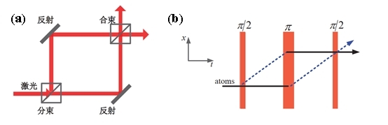圖 5 (a)Mach-Zehnder光學(xué)干涉儀示意圖 (b)三脈沖原子干涉儀示意圖