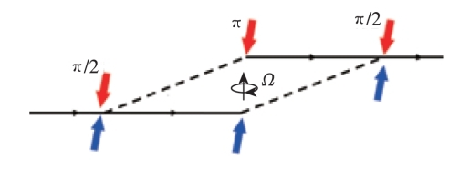 原子干涉陀螺儀的原理與光學(xué)干涉陀螺儀類似,利用了原子作為物質(zhì)波的波動性,基于Sagnac效應(yīng)完成角速度的測量。原子干涉陀螺儀工作過程主要包含原子團制備、原子分束、原子反射、原子合束和干涉相位測量,其基本原理如圖 8所示。原子束中的原子經(jīng)內(nèi)態(tài)選擇后全部處于基態(tài),然后經(jīng)拉曼光脈沖分別實現(xiàn)分束、反射和合束,*后通過干涉條紋的相位測量獲取轉(zhuǎn)動信息。
